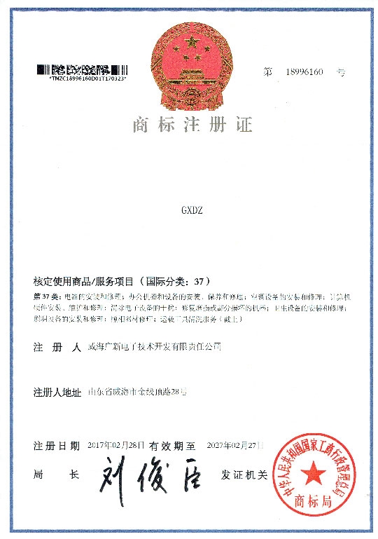 公司取得了“GXDZ”商标注册证书,今后广新公司各位员工会通过共同努力提高“GXDZ”品牌的知名度,树立企业形象,使得自己的品牌的内在价值不断提高。